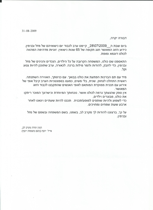 על כך ברצוננו להודות לך מקרב לב, בשמנו, בשם המשפחה ובשמם של מזל ובנימין.